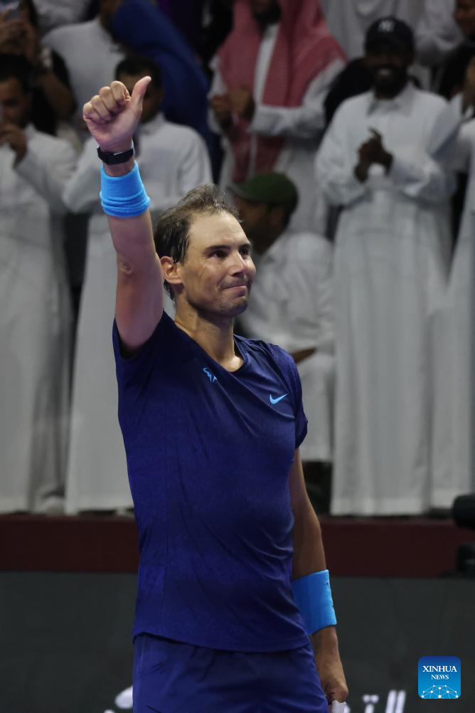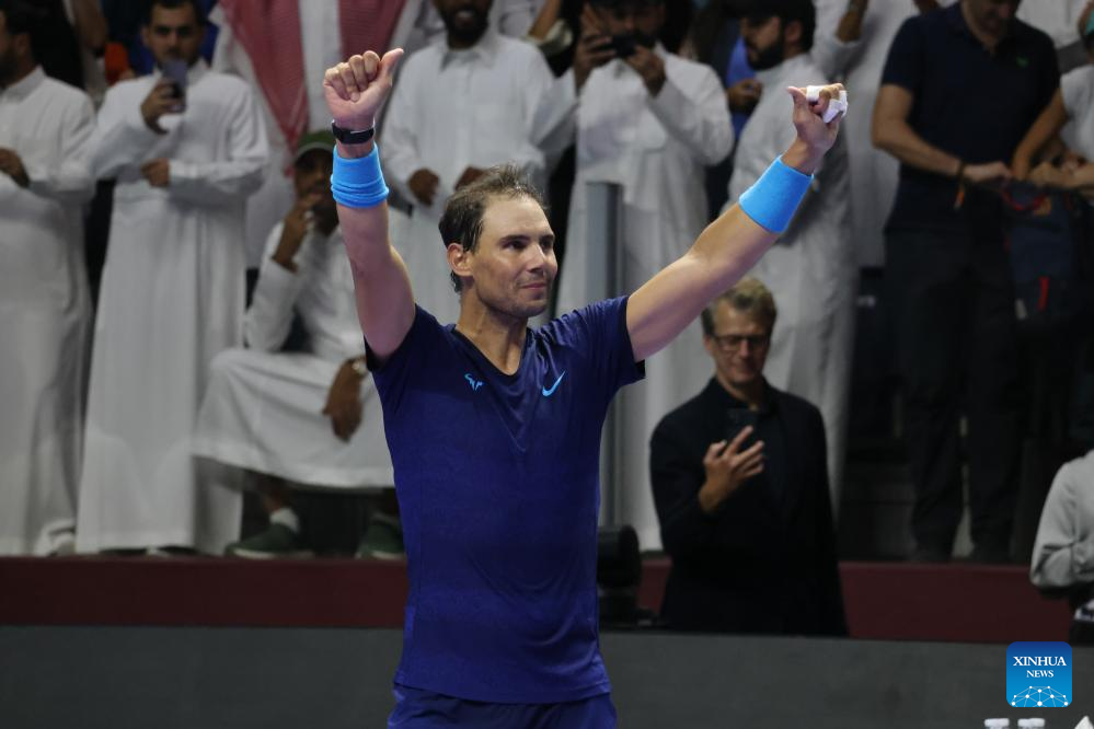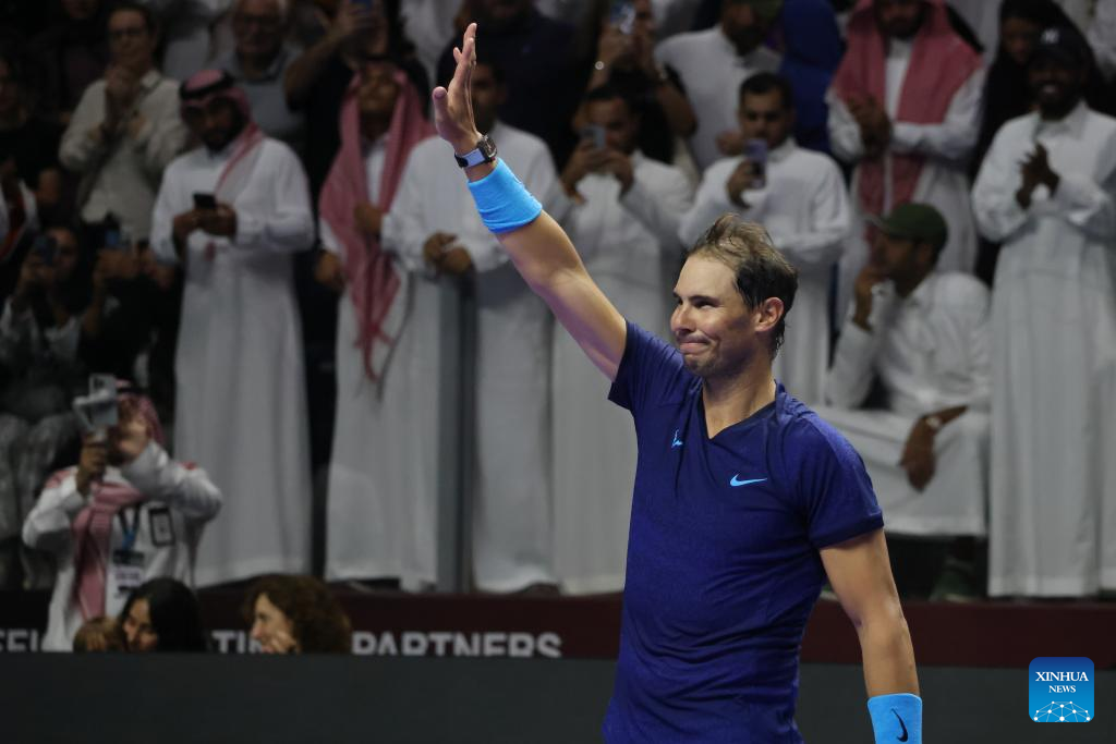 Rafael Nadal of Spain greets the spectators after the third-place match against Novak Djokovic of Serbia at Saudi Arabia's "6 Kings Slam" exhibition tennis tournament in Riyadh, Saudi Arabia, Oct. 19, 2024. (Xinhua/Luo Chen)