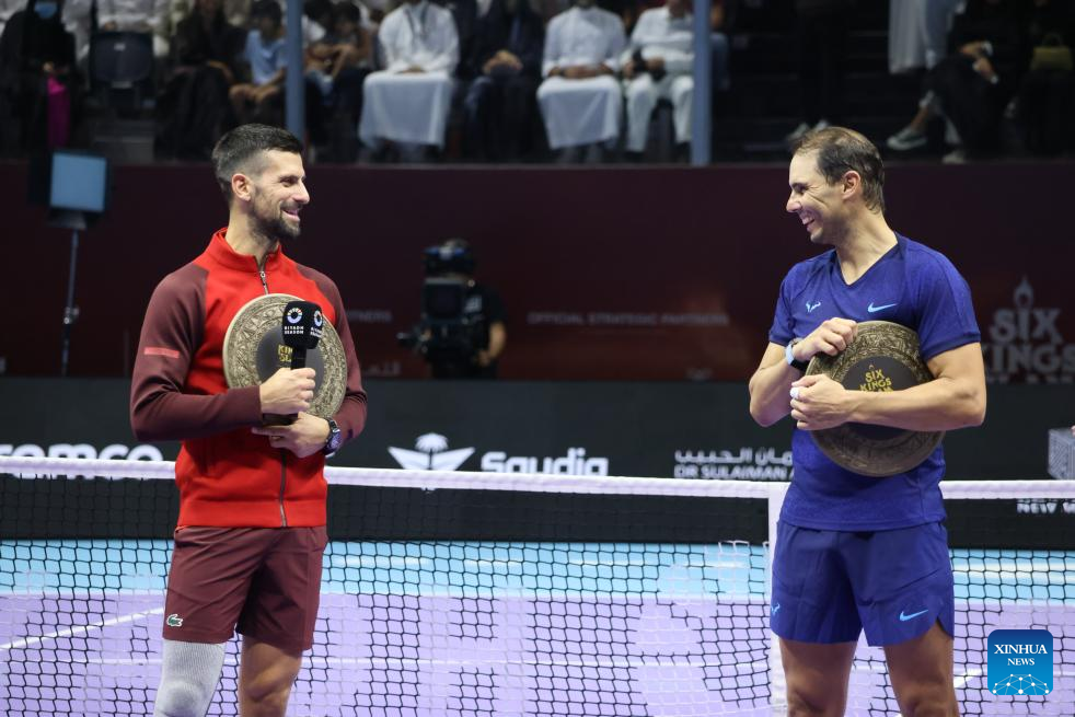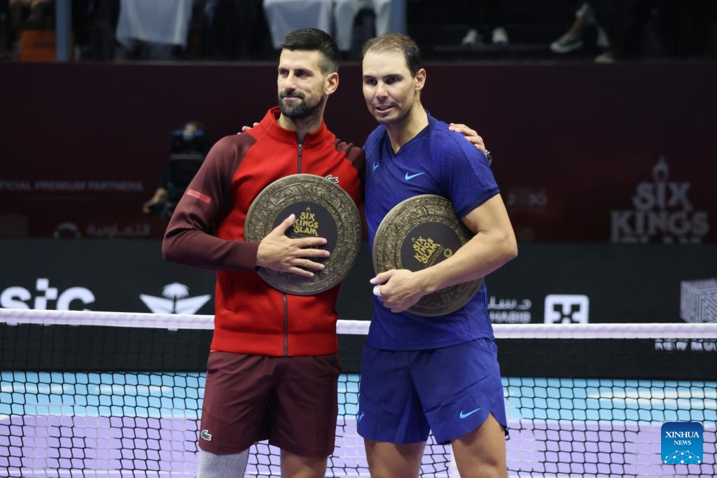 Novak Djokovic (L) of Serbia and Rafael Nadal of Spain attend the awarding ceremony after their third-place match at Saudi Arabia's "6 Kings Slam" exhibition tennis tournament in Riyadh, Saudi Arabia, Oct. 19, 2024. (Xinhua/Luo Chen)