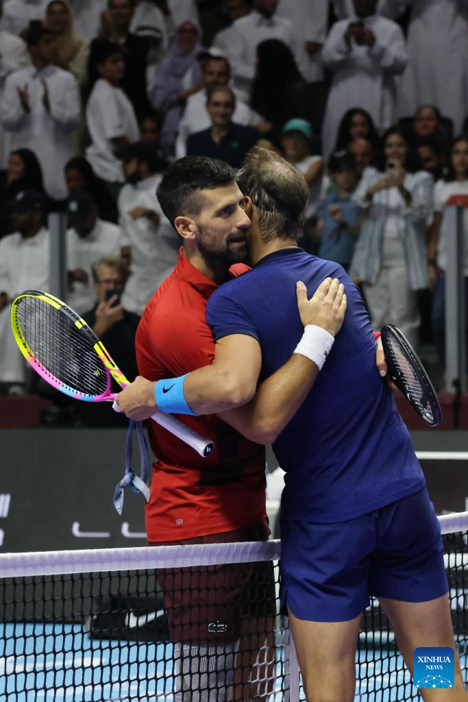 Novak Djokovic (L) of Serbia and Rafael Nadal of Spain shake hands after the third-place match at Saudi Arabia's "6 Kings Slam" exhibition tennis tournament in Riyadh, Saudi Arabia, Oct. 19, 2024. (Xinhua/Luo Chen)