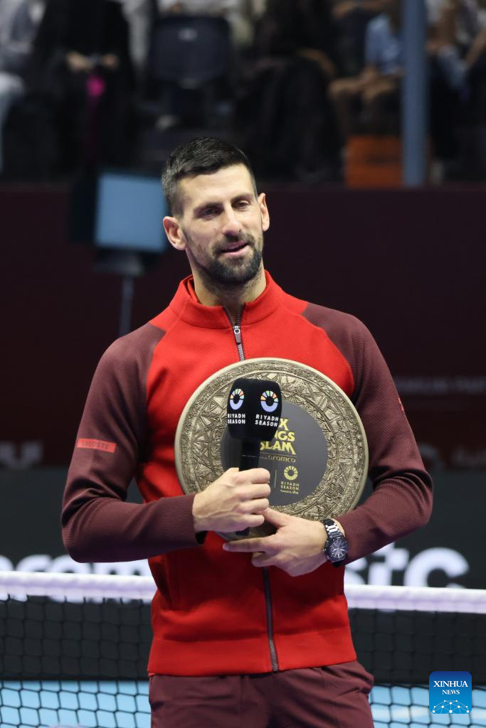 Novak Djokovic of Serbia speaks during the awarding ceremony after winning the third-place match against Rafael Nadal of Spain at Saudi Arabia's "6 Kings Slam" exhibition tennis tournament in Riyadh, Saudi Arabia, Oct. 19, 2024. (Xinhua/Luo Chen)