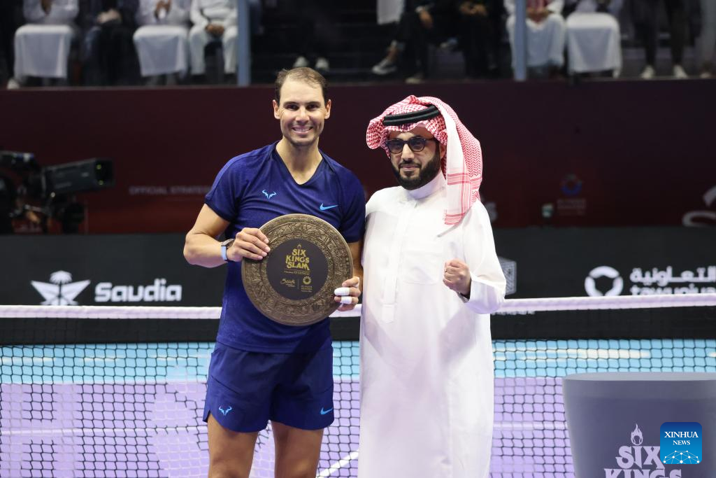 Rafael Nadal (L) of Spain poses with Saudi Arabia's General Entertainment Authority Chairman Turki Al-Sheikh during the awarding ceremony after the third-place match against Novak Djokovic of Serbia at Saudi Arabia's "6 Kings Slam" exhibition tennis tournament in Riyadh, Saudi Arabia, Oct. 19, 2024. (Xinhua/Luo Chen)