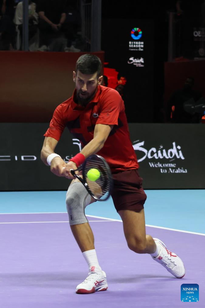 Novak Djokovic of Serbia hits a return the third-place match against Rafael Nadal of Spain at Saudi Arabia's "6 Kings Slam" exhibition tennis tournament in Riyadh, Saudi Arabia, Oct. 19, 2024. (Xinhua/Luo Chen)