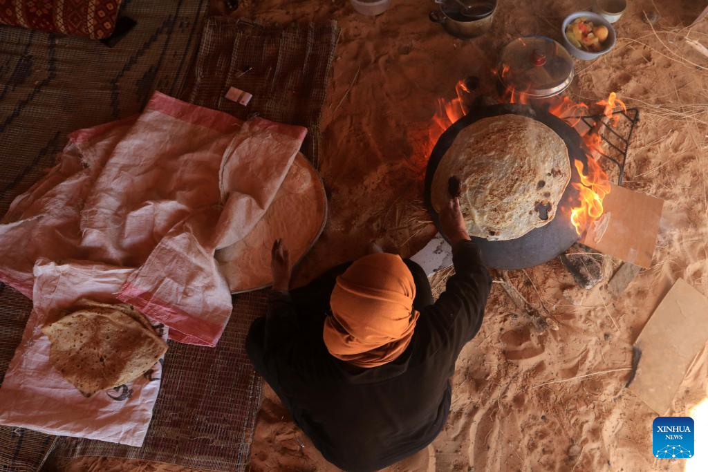 A Bedouin woman prepares food in Wadi Rum, Jordan, Oct. 11, 2024. The Bedouin means desert dwellers in Arabic, who are nomadic Arab tribes historically inhabited the desert regions in the Arabian Peninsula, North Africa, etc. With the changes of history, many Bedouins have lived a settled life, but some still live a nomadic life for part of the year. (Photo by Mohammad Abu Ghosh/Xinhua)