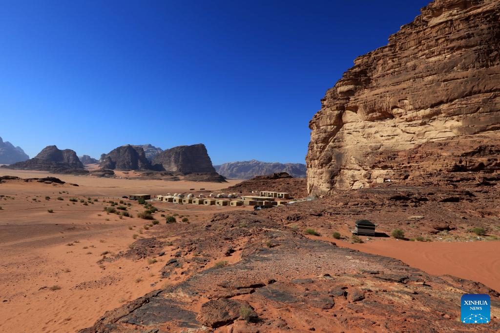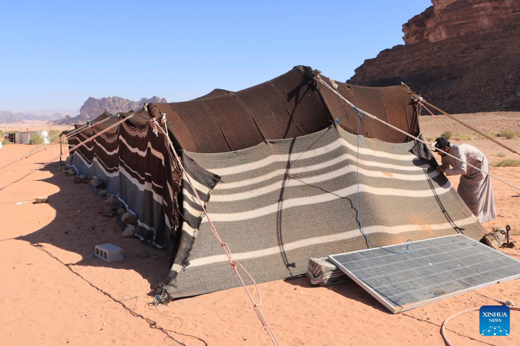 This photo taken on Oct. 11, 2024 shows mordern tents for tourists in Wadi Rum, Jordan. The Bedouin means desert dwellers in Arabic, who are nomadic Arab tribes historically inhabited the desert regions in the Arabian Peninsula, North Africa, etc. With the changes of history, many Bedouins have lived a settled life, but some still live a nomadic life for part of the year. (Photo by Mohammad Abu Ghosh/Xinhua)