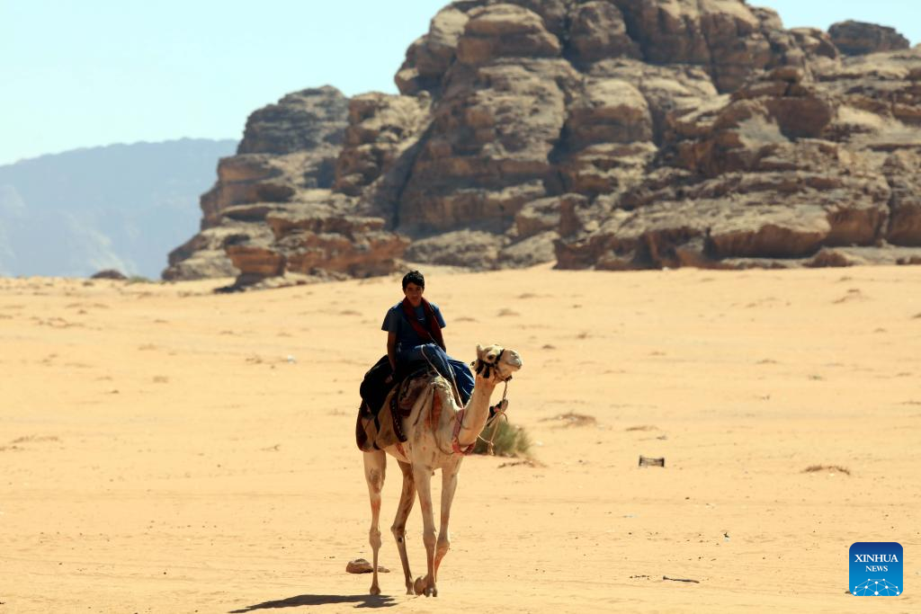 A Bedouin rides his camel in Wadi Rum, Jordan, Oct. 11, 2024. The Bedouin means desert dwellers in Arabic, who are nomadic Arab tribes historically inhabited the desert regions in the Arabian Peninsula, North Africa, etc. With the changes of history, many Bedouins have lived a settled life, but some still live a nomadic life for part of the year. (Photo by Mohammad Abu Ghosh/Xinhua)