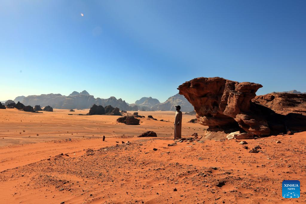 A Bedouin stands in the desert in Wadi Rum, Jordan, on Oct. 11, 2024. The Bedouin means desert dwellers in Arabic, who are nomadic Arab tribes historically inhabited the desert regions in the Arabian Peninsula, North Africa, etc. With the changes of history, many Bedouins have lived a settled life, but some still live a nomadic life for part of the year. (Photo by Mohammad Abu Ghosh/Xinhua)