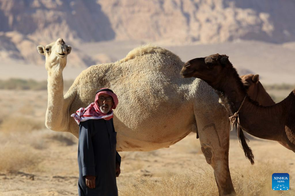 A Bedouin is pictured with his camels in Wadi Rum, Jordan, Oct. 11, 2024. The Bedouin means desert dwellers in Arabic, who are nomadic Arab tribes historically inhabited the desert regions in the Arabian Peninsula, North Africa, etc. With the changes of history, many Bedouins have lived a settled life, but some still live a nomadic life for part of the year. (Photo by Mohammad Abu Ghosh/Xinhua)