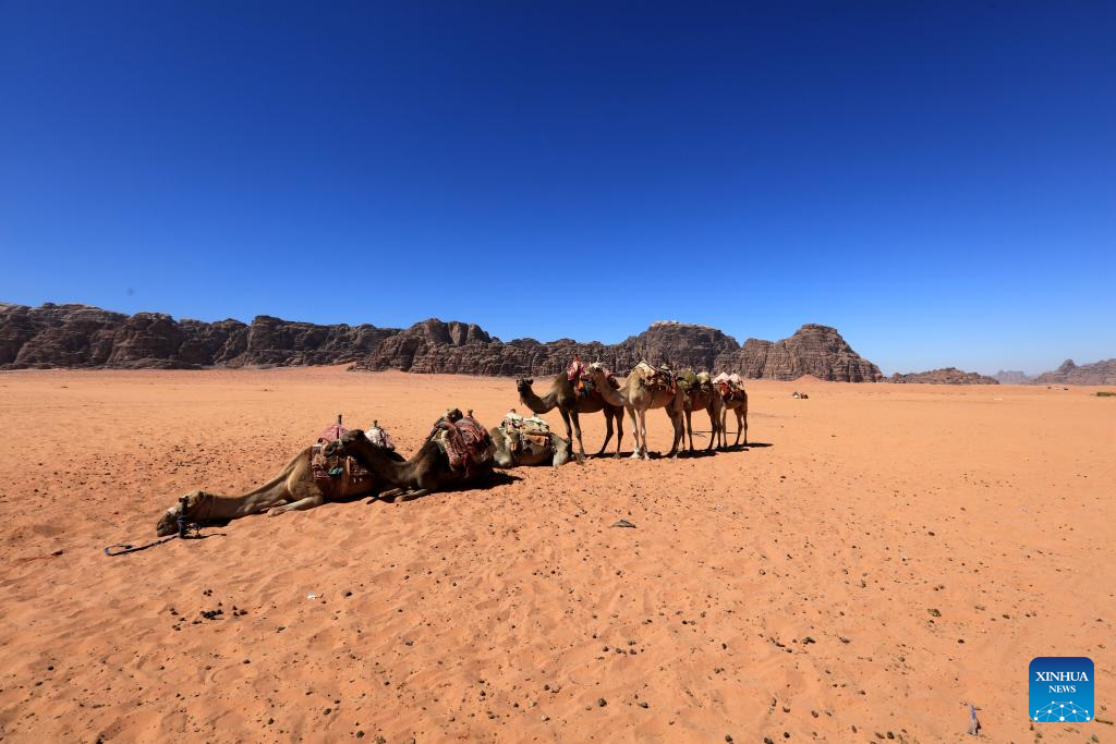 This photo taken on Oct. 11, 2024 shows camels for tourism in Wadi Rum, Jordan. The Bedouin means desert dwellers in Arabic, who are nomadic Arab tribes historically inhabited the desert regions in the Arabian Peninsula, North Africa, etc. With the changes of history, many Bedouins have lived a settled life, but some still live a nomadic life for part of the year. (Photo by Mohammad Abu Ghosh/Xinhua)