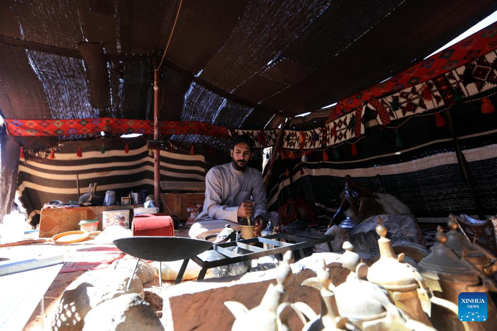 A Bedouin grinds coffee at a "house of hair", a traditional Bedouin house made of goat hair and sheep's wool, in Wadi Rum, Jordan, Oct. 11, 2024. The Bedouin means desert dwellers in Arabic, who are nomadic Arab tribes historically inhabited the desert regions in the Arabian Peninsula, North Africa, etc. With the changes of history, many Bedouins have lived a settled life, but some still live a nomadic life for part of the year. (Photo by Mohammad Abu Ghosh/Xinhua)