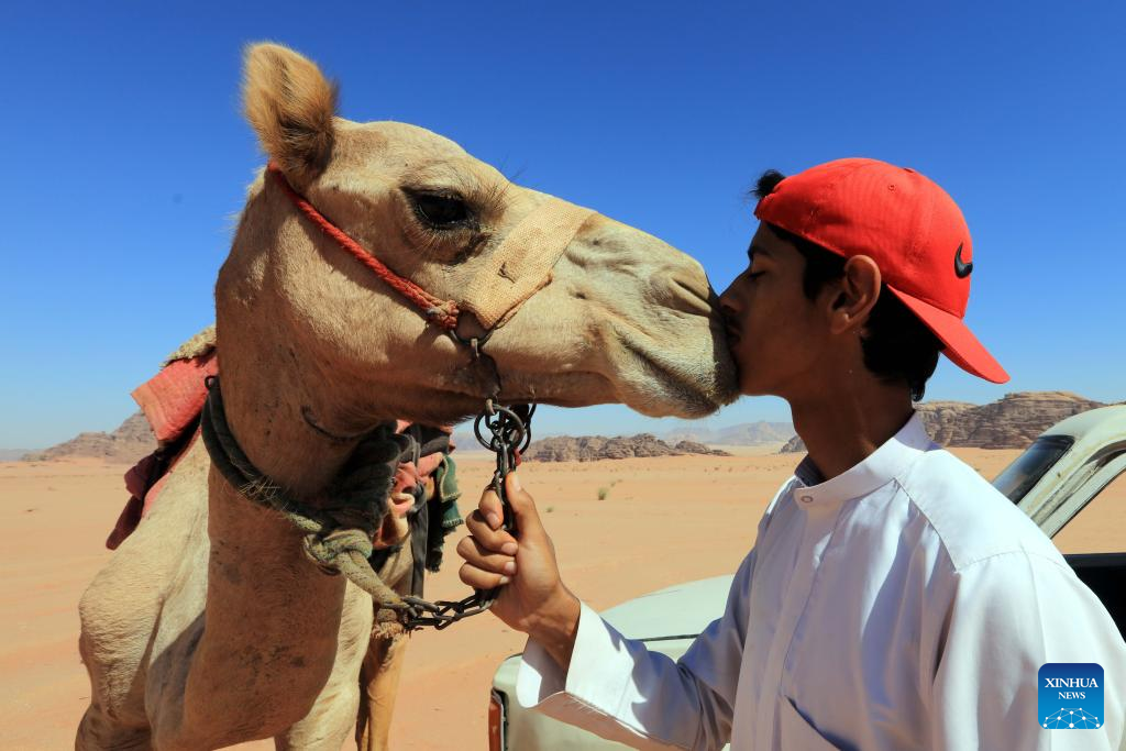 A Bedouin kisses his camel in Wadi Rum, Jordan, on Oct. 11, 2024. The Bedouin means desert dwellers in Arabic, who are nomadic Arab tribes historically inhabited the desert regions in the Arabian Peninsula, North Africa, etc. With the changes of history, many Bedouins have lived a settled life, but some still live a nomadic life for part of the year. (Photo by Mohammad Abu Ghosh/Xinhua)
