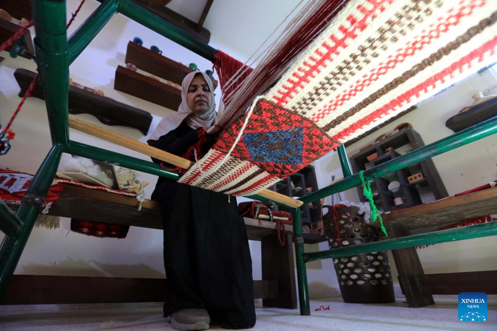 A Bedouin woman shows how to weave strips for "house of hair", a traditional Bedouin house made of goat hair and sheep's wool in Wadi Rum, Jordan, Oct. 11, 2024. The Bedouin means desert dwellers in Arabic, who are nomadic Arab tribes historically inhabited the desert regions in the Arabian Peninsula, North Africa, etc. With the changes of history, many Bedouins have lived a settled life, but some still live a nomadic life for part of the year. (Photo by Mohammad Abu Ghosh/Xinhua)