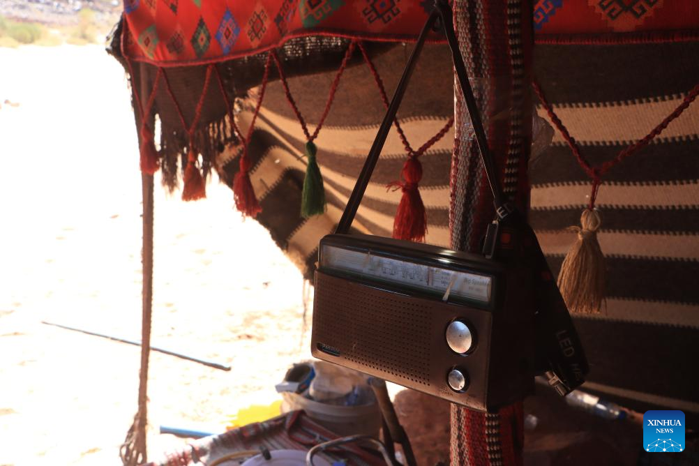 This photo taken on Oct. 11, 2024 shows a radio used in a "house of hair", a traditional Bedouin house made of goat hair and sheep's wool, in Wadi Rum, Jordan. The Bedouin means desert dwellers in Arabic, who are nomadic Arab tribes historically inhabited the desert regions in the Arabian Peninsula, North Africa, etc. With the changes of history, many Bedouins have lived a settled life, but some still live a nomadic life for part of the year. (Xinhua/He Yiping)