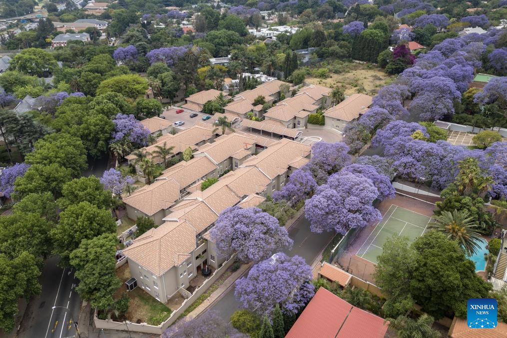 This aerial photo taken on Oct. 22, 2024 shows blooming jacaranda trees in Johannesburg, South Africa. (Photo by Shiraaz Mohamed/Xinhua)