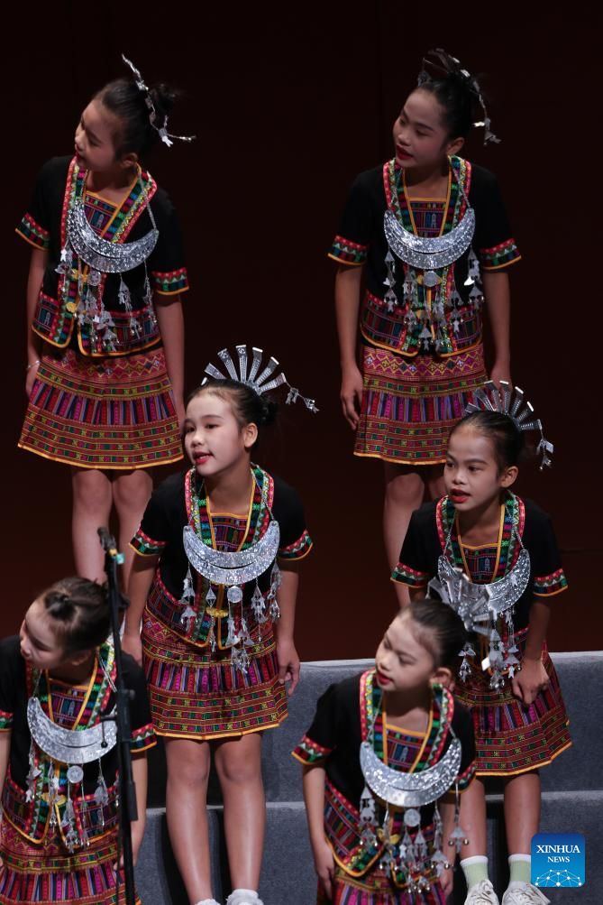 A children's chorus from Wuzhishan City performs during a Sino-French children's chorus festival held at Hainan Song and Dance Theater in Haikou, south China's Hainan Province, Oct. 25, 2024. A children's chorus festival kicked off here Friday to highlight Sino-French friendship and promote Sino-French cultural exchanges. During the event, two children's choruses from Wuzhishan of China's Hainan and Paris of France are scheduled to stage three performances at Hainan Song and Dance Theater, Hainan University and Maona Village in Wuzhishan City respectively. (Xinhua/Zhang Liyun)