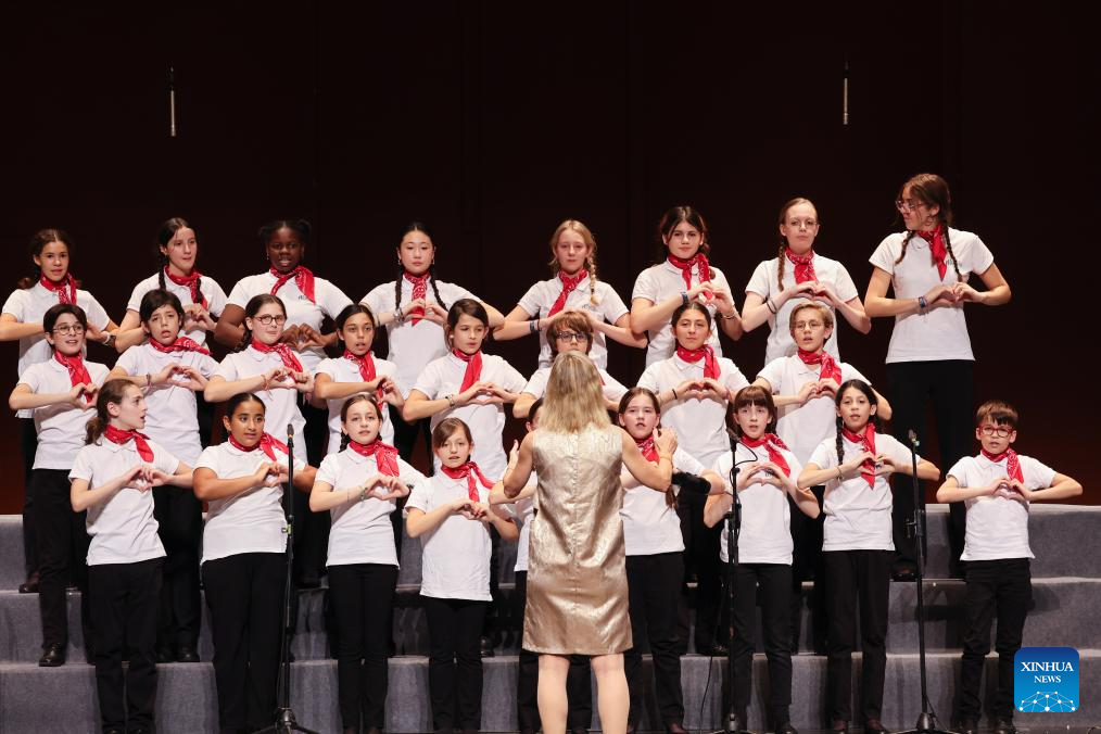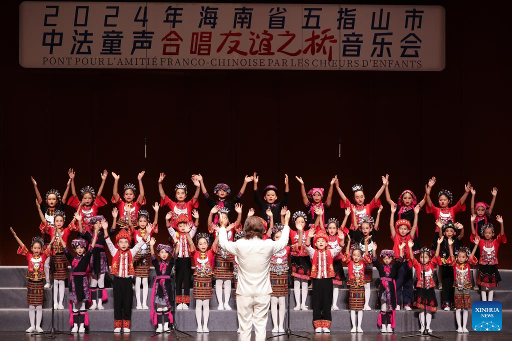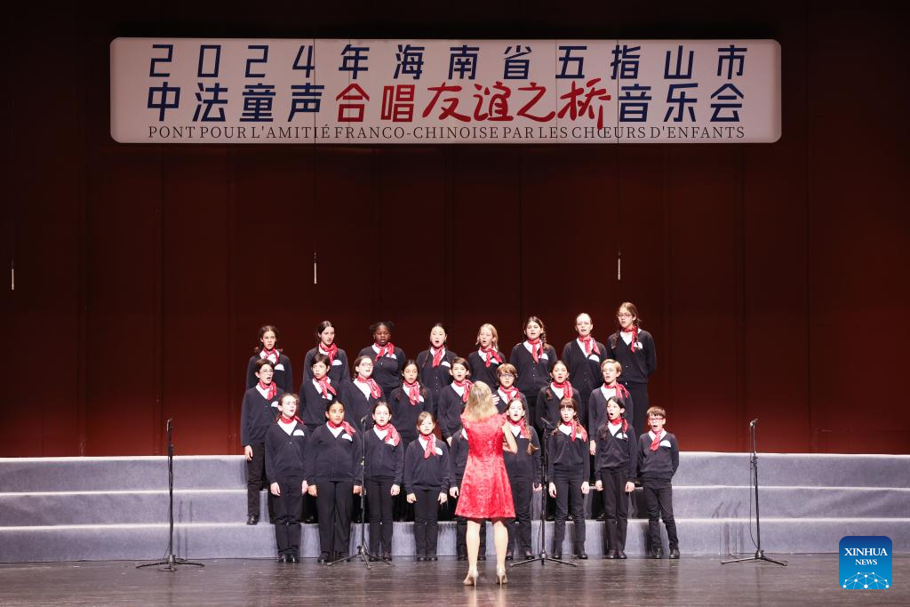A children's chorus from Paris performs during a Sino-French children's chorus festival held at Hainan Song and Dance Theater in Haikou, south China's Hainan Province, Oct. 25, 2024. A children's chorus festival kicked off here Friday to highlight Sino-French friendship and promote Sino-French cultural exchanges. During the event, two children's choruses from Wuzhishan of China's Hainan and Paris of France are scheduled to stage three performances at Hainan Song and Dance Theater, Hainan University and Maona Village in Wuzhishan City respectively. (Xinhua/Zhang Liyun)