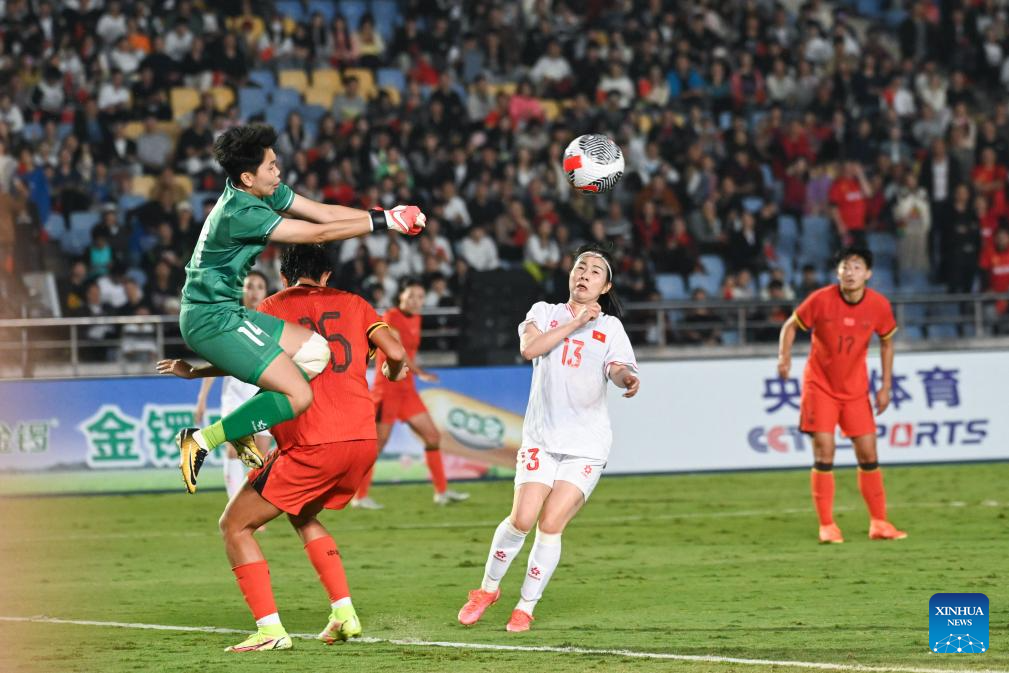 Goalkeeper Tran Thi Kim Thang (L) of Vietnam makes a save during the match between China and Vietnam at 2024 CFA Team China International Women's Football Tournament Yongchuan in Chongqing, southwest China, Oct. 29, 2024. (Xinhua/Zhang Ziyu)