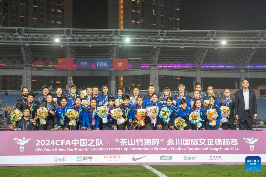 Third place winner Team Uzbekistan celebrate during the awarding ceremony after the match between China and Vietnam at 2024 CFA Team China International Women's Football Tournament Yongchuan in Chongqing, southwest China, Oct. 29, 2024. (Xinhua/Huang Wei)