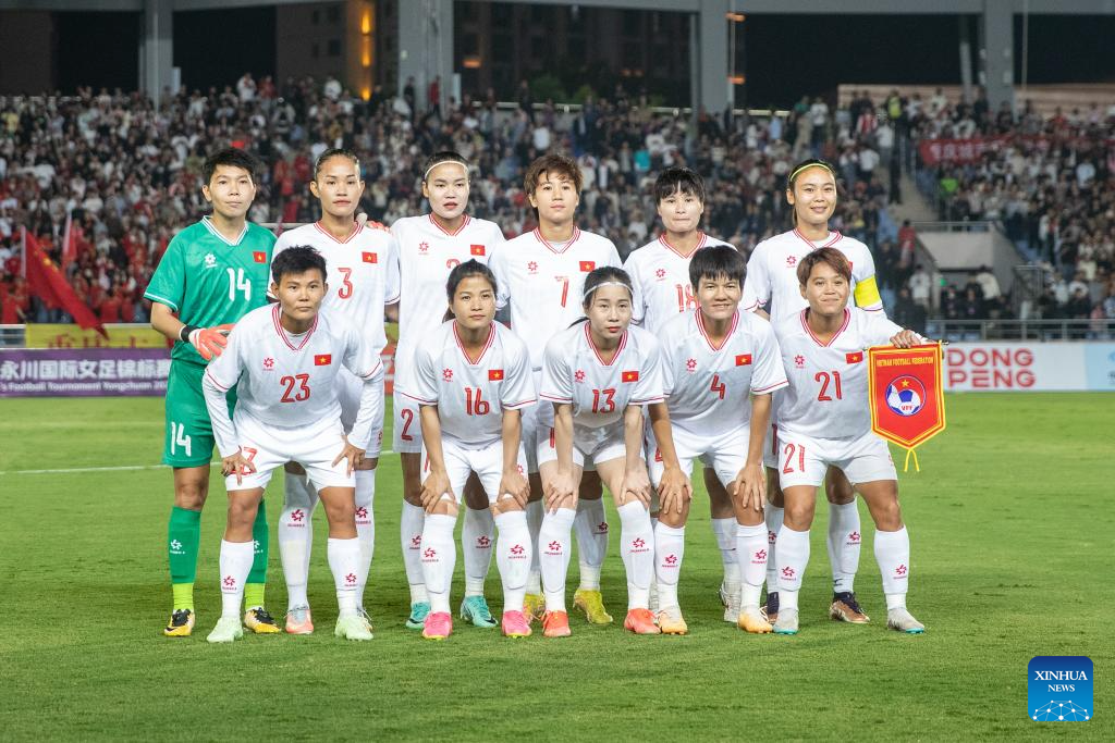 Players of Vietnam pose for a group photo before the match between China and Vietnam at 2024 CFA Team China International Women's Football Tournament Yongchuan in Chongqing, southwest China, Oct. 29, 2024. (Xinhua/Huang Wei)