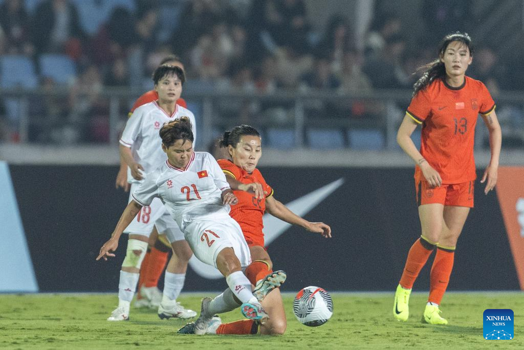 Wang Yanwen (top) of China heads the ball during the match between China and Vietnam at 2024 CFA Team China International Women's Football Tournament Yongchuan in Chongqing, southwest China, Oct. 29, 2024. (Xinhua/Huang Wei)