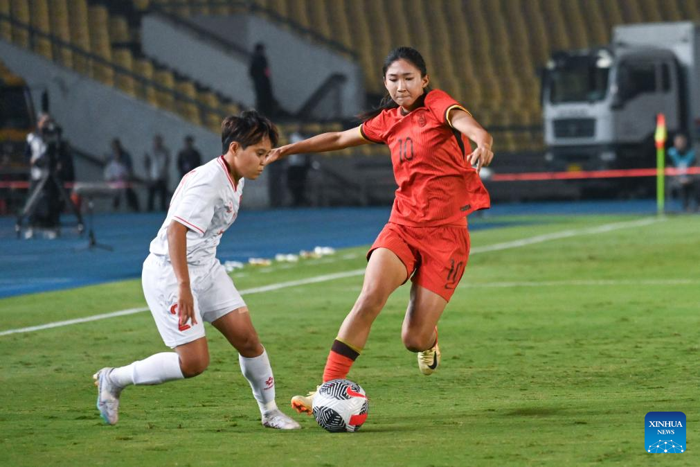 Zhang Rui (R) of China vies with Nguyen Thi Truc Huong of Vietnam during the match at 2024 CFA Team China International Women's Football Tournament Yongchuan in Chongqing, southwest China, Oct. 29, 2024. (Xinhua/Huang Wei)