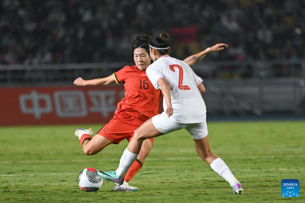 Wang Yanwen (R) of China vies with Ngan Thi Van Su of Vietnam during the match at 2024 CFA Team China International Women's Football Tournament Yongchuan in Chongqing, southwest China, Oct. 29, 2024. (Xinhua/Zhang Ziyu)
