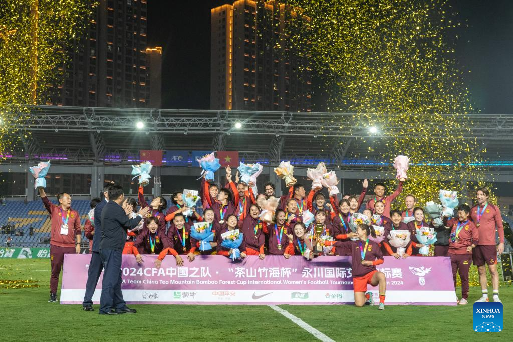 Team China celebrate winning champion during the awarding ceremony after the match between China and Vietnam at 2024 CFA Team China International Women's Football Tournament Yongchuan in Chongqing, southwest China, Oct. 29, 2024. (Xinhua/Huang Wei)
