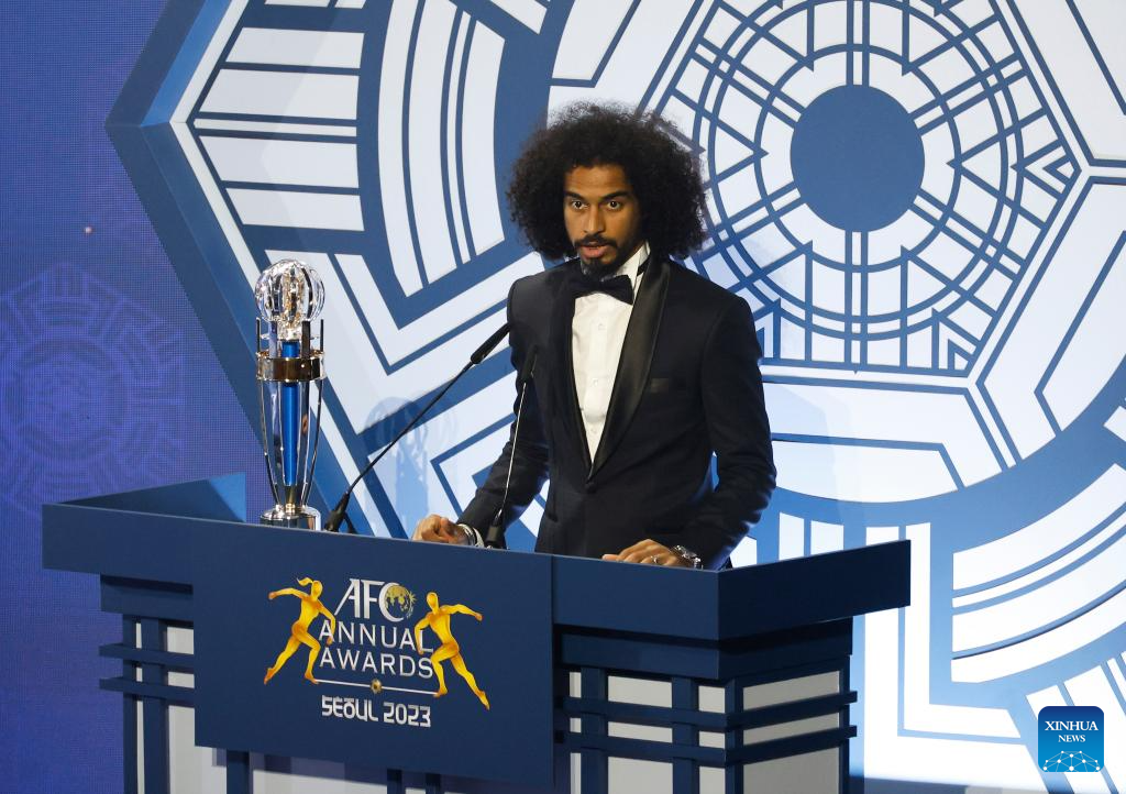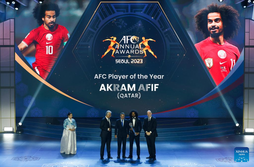 Qatar's player Akram Afif speaks after receiving the Player of the Year award during the Asian Football Association (AFC) Annual Awards ceremony 2023 in Seoul, South Korea, Oct. 29, 2024. (Photo by Jun Hyosang/Xinhua)