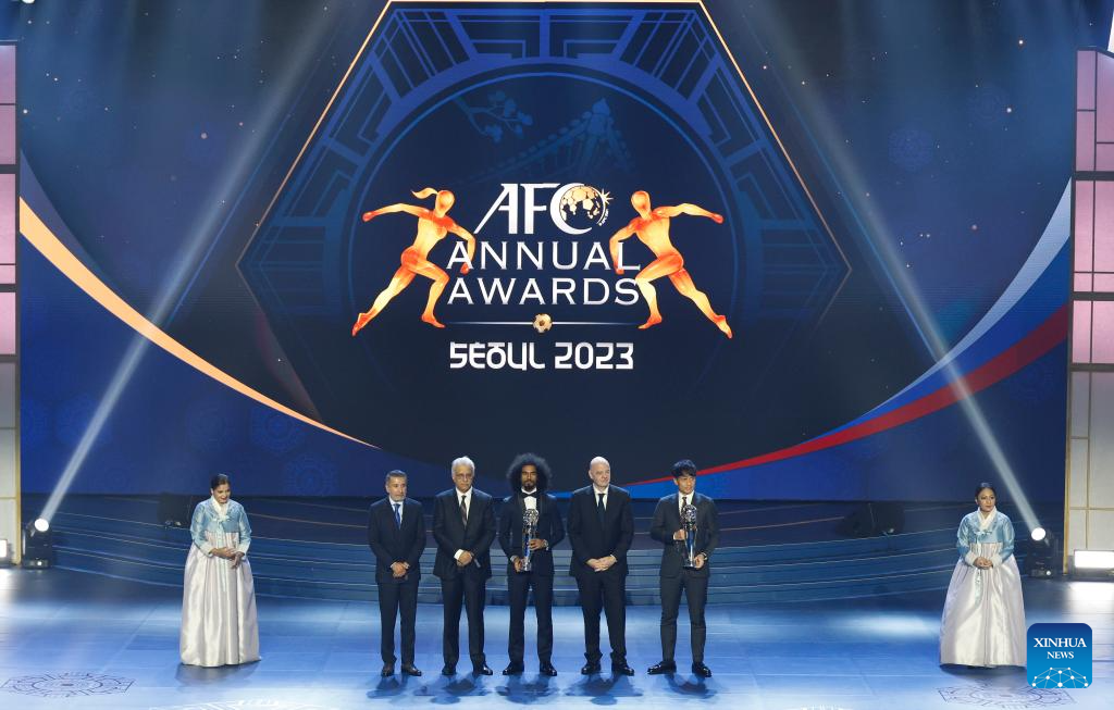 Qatar's player Akram Afif (C) poses with FIFA President Gianni Infantino (3rd R) after receiving the Player of the Year award during the Asian Football Association (AFC) Annual Awards ceremony 2023 in Seoul, South Korea, Oct. 29, 2024. (Photo by Jun Hyosang/Xinhua)