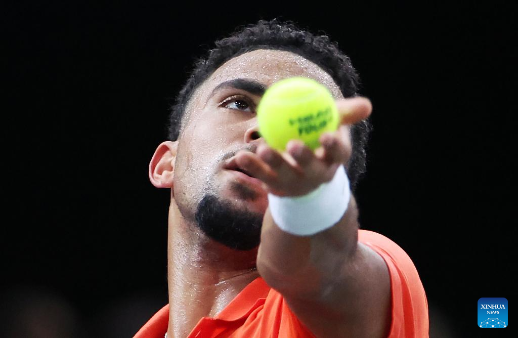 Arthur Fils of France serves during the singles round of 16 match between Alexander Zverev of Germany and Arthur Fils of France at Paris ATP Masters 1000 tennis tournament in Paris, France, Oct. 31, 2024. (Xinhua/Gao Jing)
