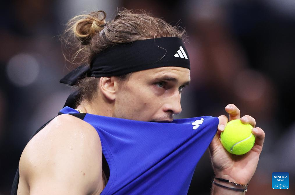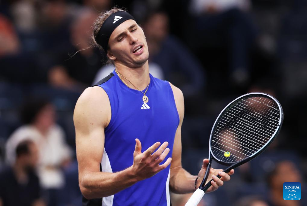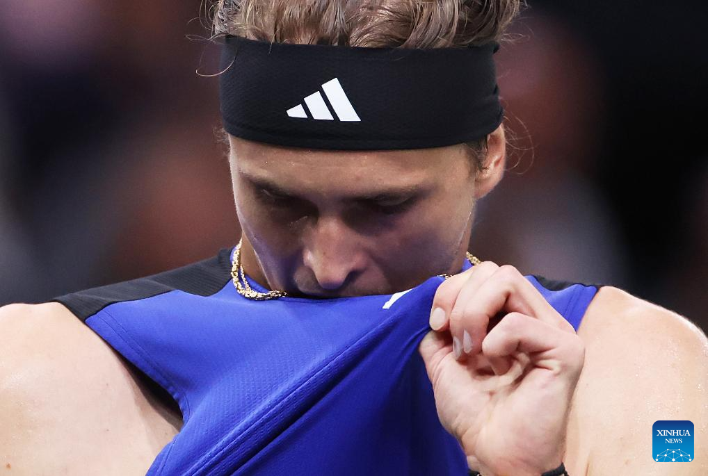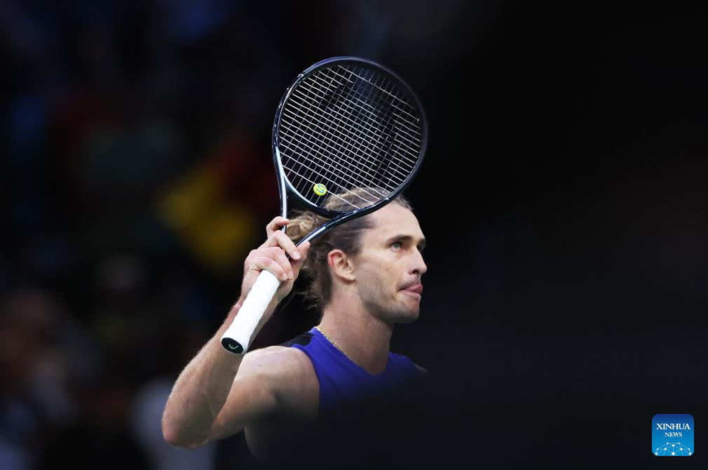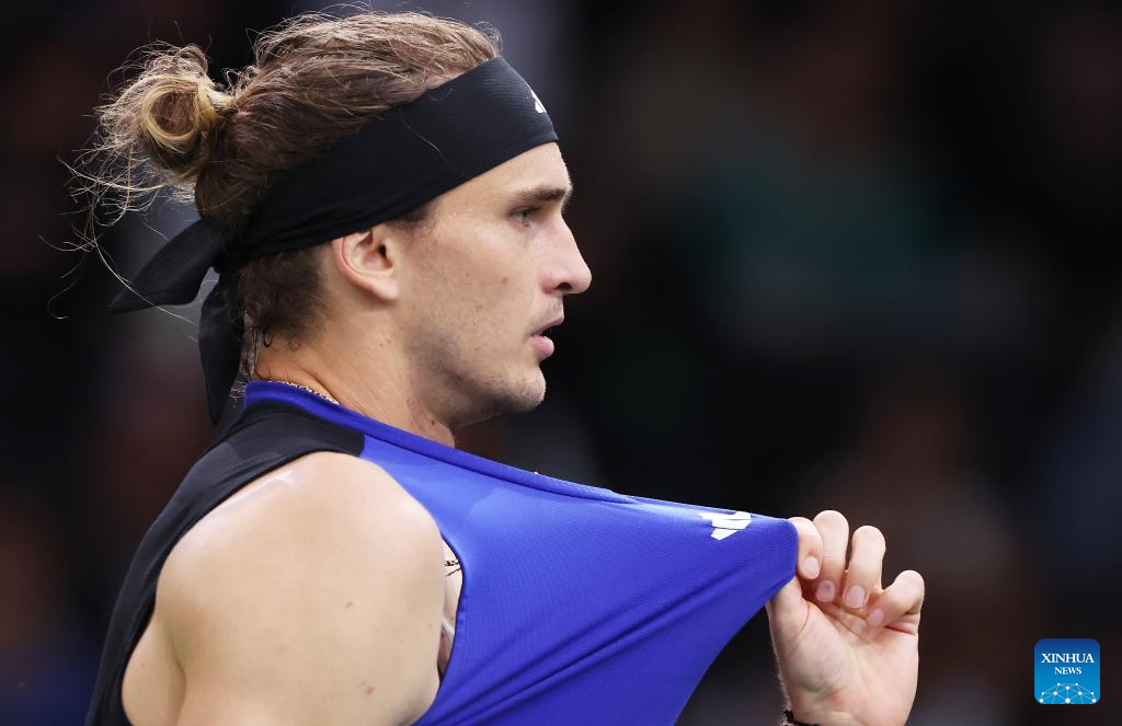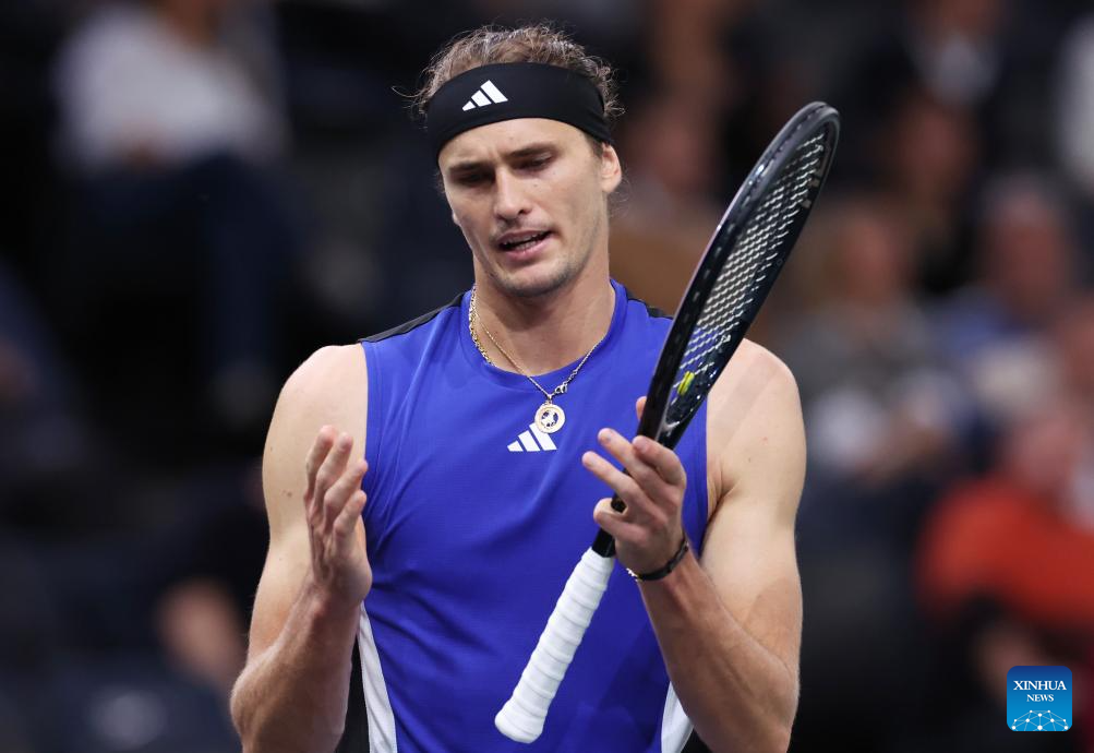 Alexander Zverev of Germany reacts during the singles round of 16 match between Alexander Zverev of Germany and Arthur Fils of France at Paris ATP Masters 1000 tennis tournament in Paris, France, Oct. 31, 2024. (Xinhua/Gao Jing)