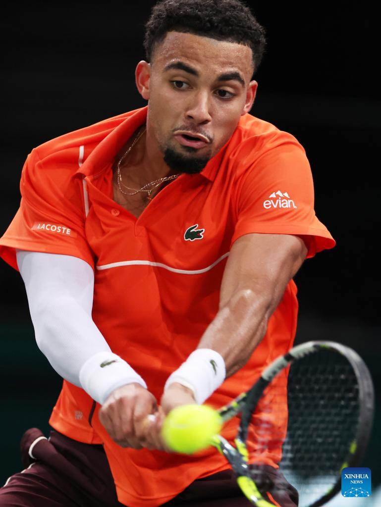 Arthur Fils of France hits a return during the singles round of 16 match between Alexander Zverev of Germany and Arthur Fils of France at Paris ATP Masters 1000 tennis tournament in Paris, France, Oct. 31, 2024. (Xinhua/Gao Jing)