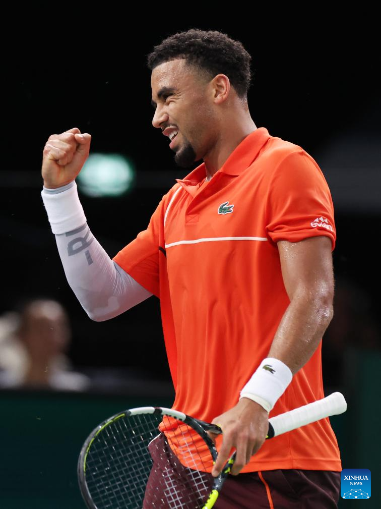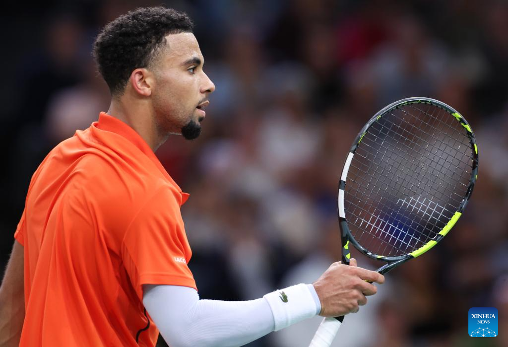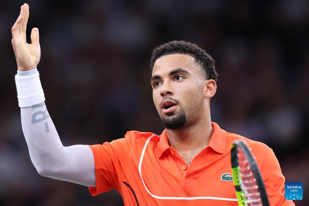 Arthur Fils of France reacts during the singles round of 16 match between Alexander Zverev of Germany and Arthur Fils of France at Paris ATP Masters 1000 tennis tournament in Paris, France, Oct. 31, 2024. (Xinhua/Gao Jing)