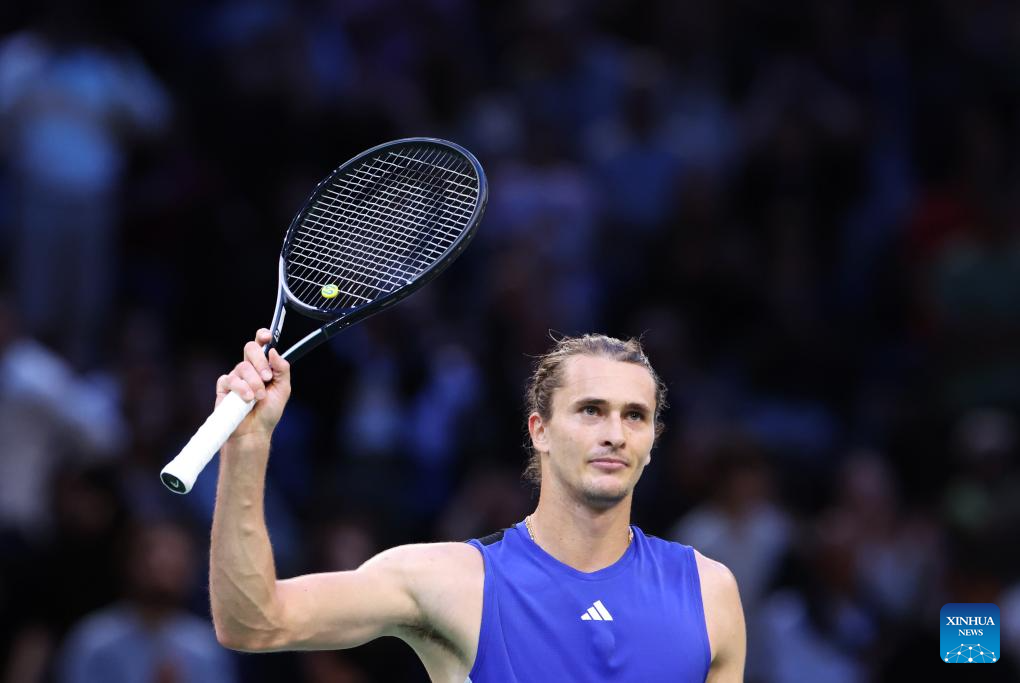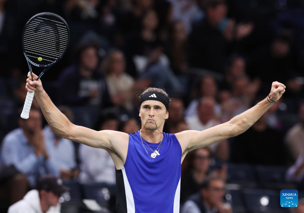 Alexander Zverev of Germany celebrates victory after the singles round of 16 match between Alexander Zverev of Germany and Arthur Fils of France at Paris ATP Masters 1000 tennis tournament in Paris, France, Oct. 31, 2024. (Xinhua/Gao Jing)