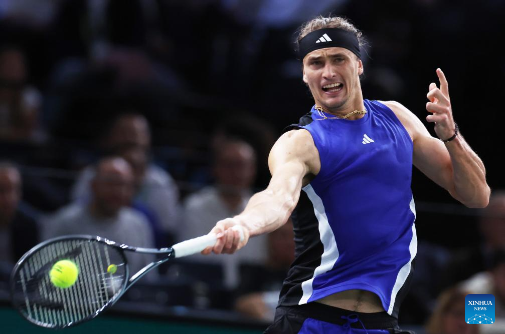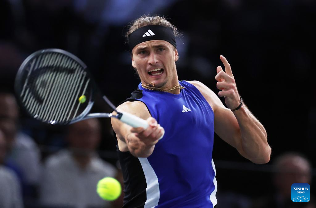 Alexander Zverev of Germany hits a return during the singles round of 16 match between Alexander Zverev of Germany and Arthur Fils of France at Paris ATP Masters 1000 tennis tournament in Paris, France, Oct. 31, 2024. (Xinhua/Gao Jing)