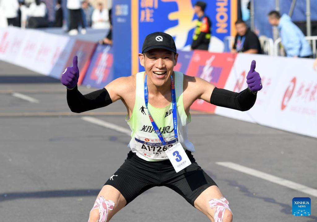 Runner Shi Pengfei poses for photos after crossing the finish line of the 2024 Zhengzhou Marathon in Zhengzhou, central China's Henan Province, Nov. 3, 2024. (Xinhua/Hao Yuan)