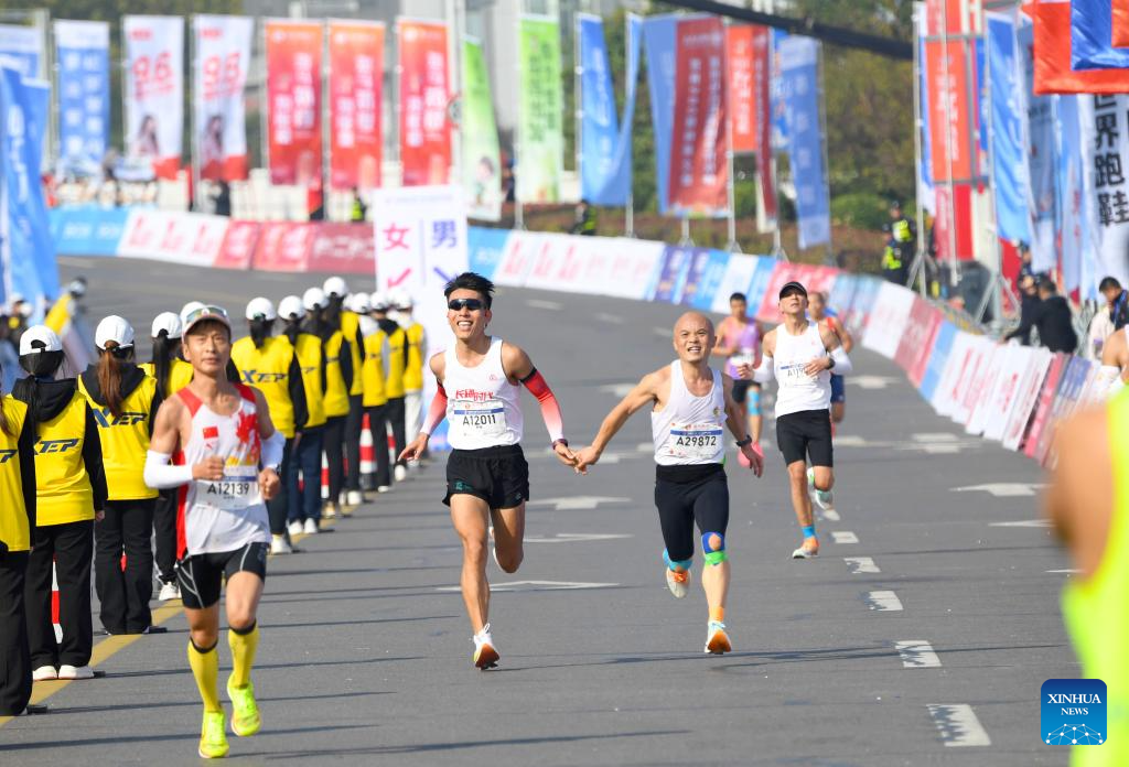 Two participants run towards the finish line hand in hand during the 2024 Zhengzhou Marathon in Zhengzhou, central China's Henan Province, Nov. 3, 2024. (Xinhua/Hao Yuan)