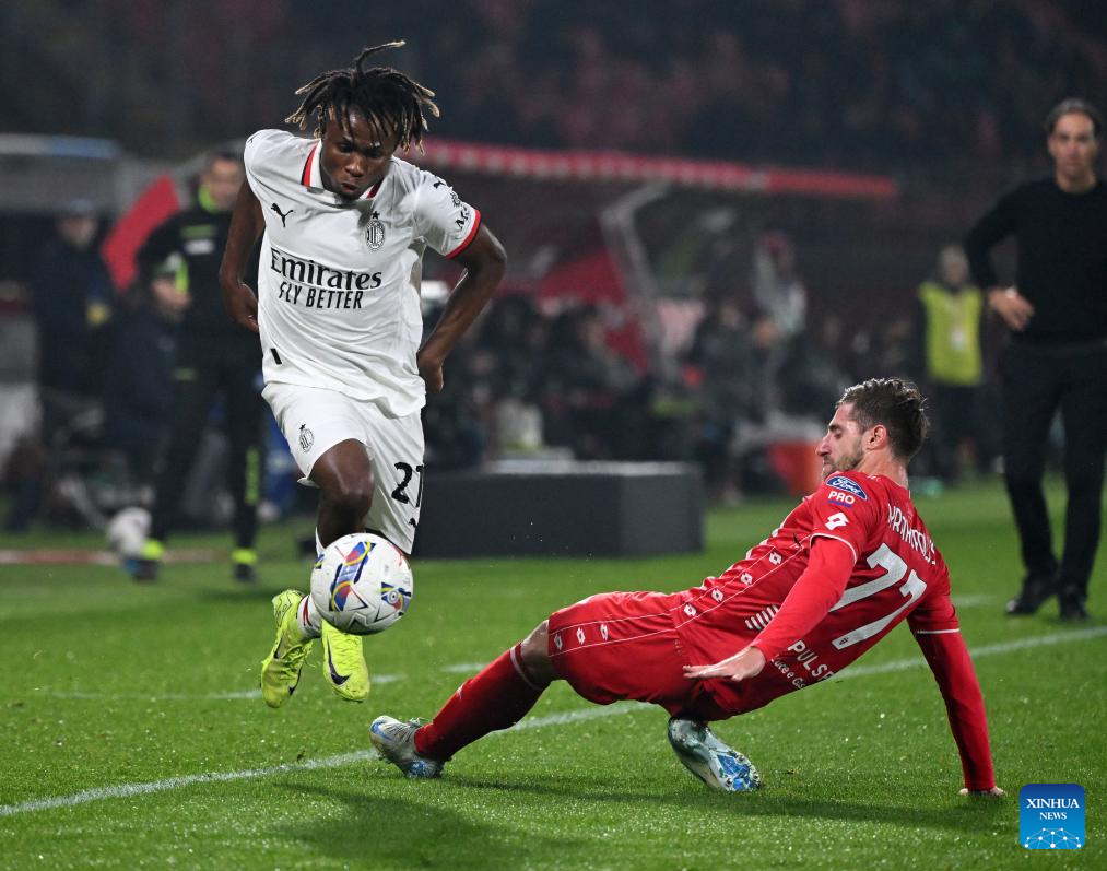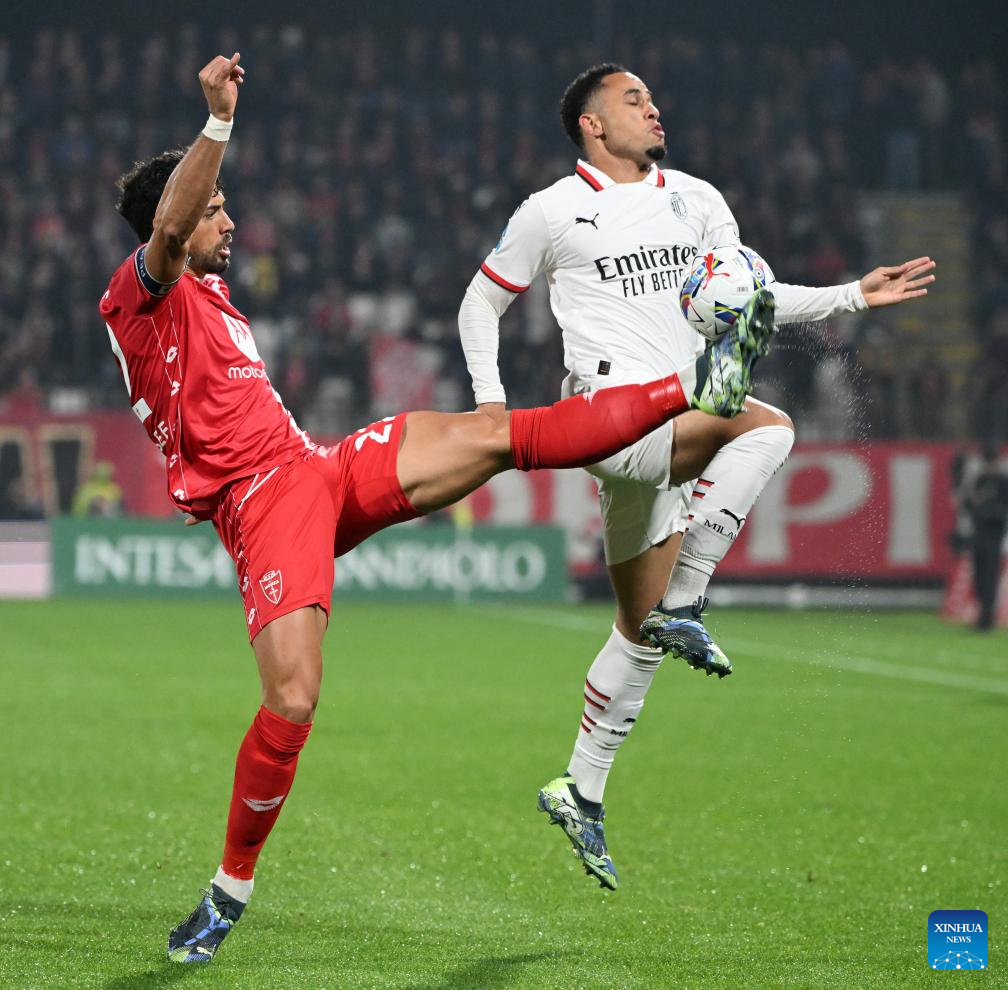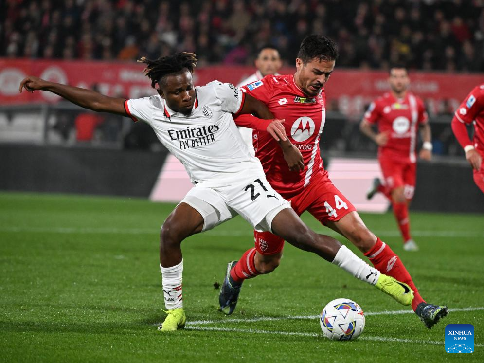 AC Milan's Samuel Chukwueze (L) vies with Monza's Andrea Carboni during a Serie A football match between Monza and AC Milan in Monza, Italy, Nov. 2, 2024. (Photo by Alberto Lingria/Xinhua)