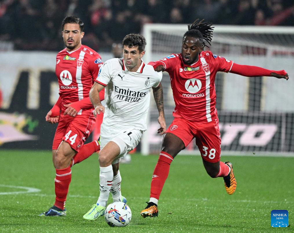 AC Milan's Christian Pulisic (C) vies with Monza's Andrea Carboni (L) and Warren Bondo during a Serie A football match between Monza and AC Milan in Monza, Italy, Nov. 2, 2024. (Photo by Alberto Lingria/Xinhua)