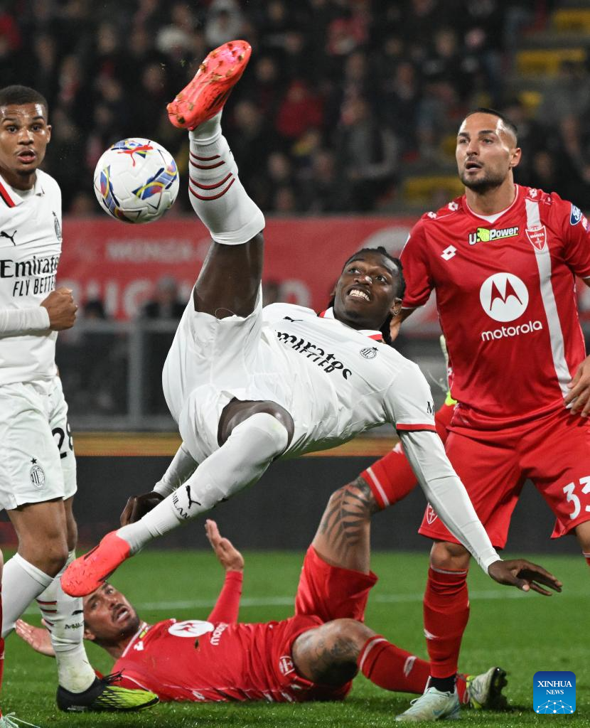 AC Milan's Rafael Leao (C) competes during a Serie A football match between Monza and AC Milan in Monza, Italy, Nov. 2, 2024. (Photo by Alberto Lingria/Xinhua)