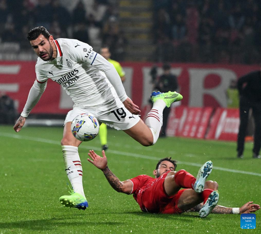 AC Milan's Theo Hernandez (L) vies with Monza's Pedro Pereira during a Serie A football match between Monza and AC Milan in Monza, Italy, Nov. 2, 2024. (Photo by Alberto Lingria/Xinhua)