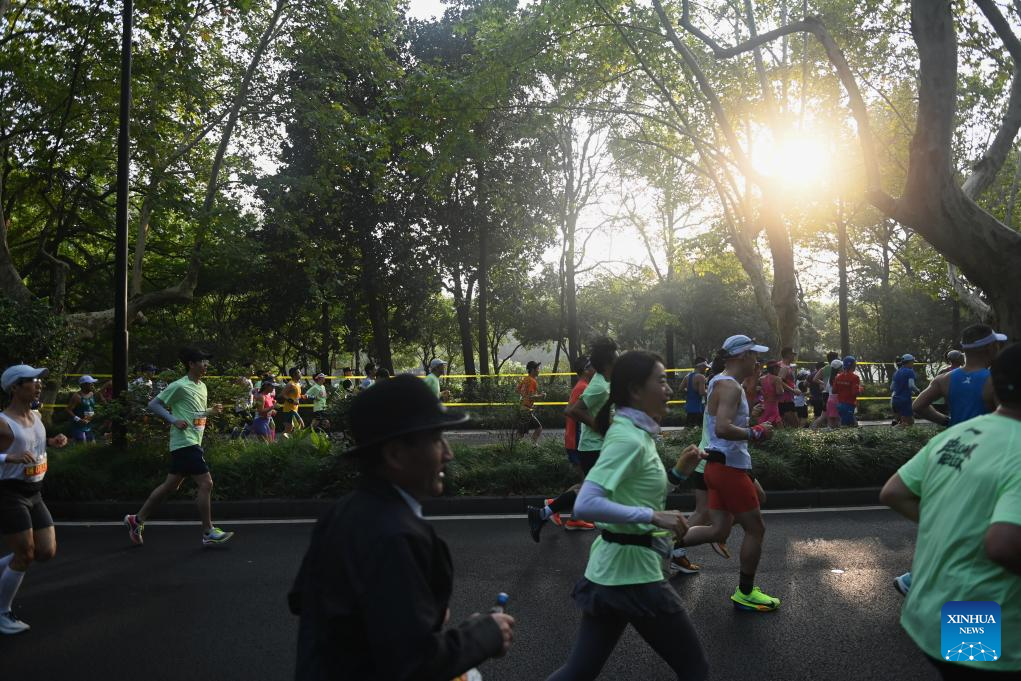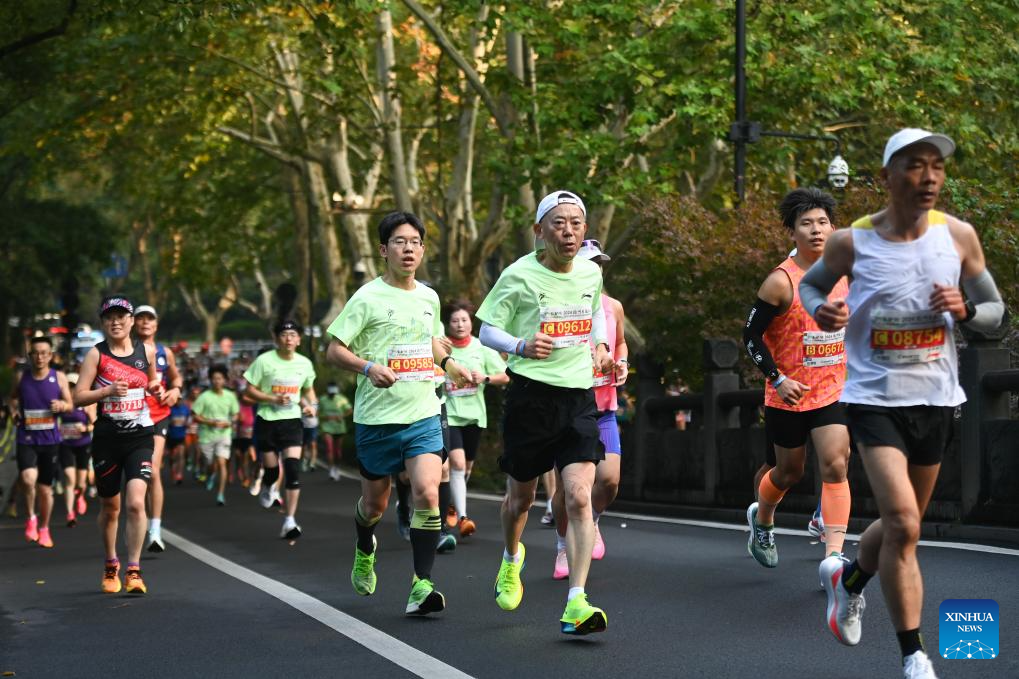 Participants run during the 2024 Hangzhou Marathon in Hangzhou, east China's Zhejiang Province, Nov. 3, 2024. (Xinhua/Huang Zongzhi)