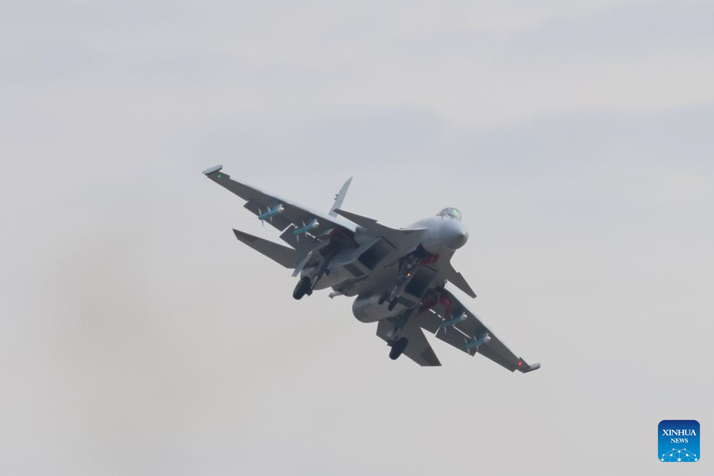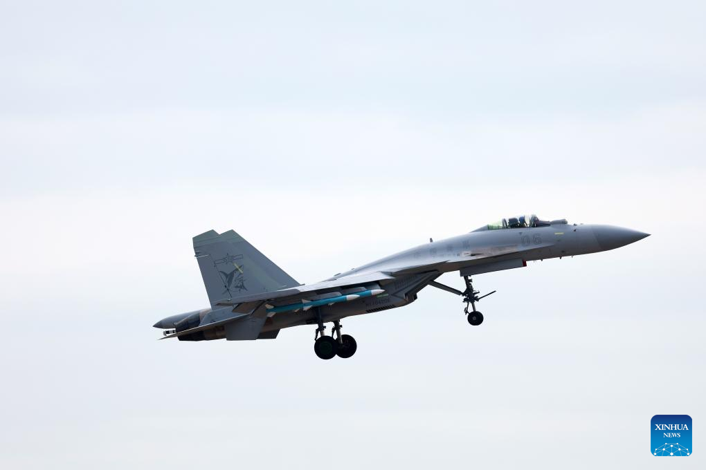 A J-15 fighter jet conducts adaptive training for the upcoming 15th Airshow China in Zhuhai, south China's Guangdong Province, Nov. 9, 2024. The 15th China International Aviation and Aerospace Exhibition, also known as Airshow China, will be held in Zhuhai from Nov. 12 to 17. (Photo by Ma Ruizhao/Xinhua)