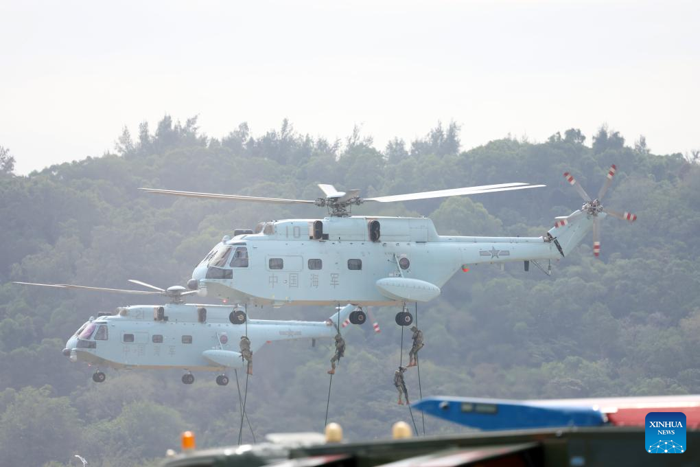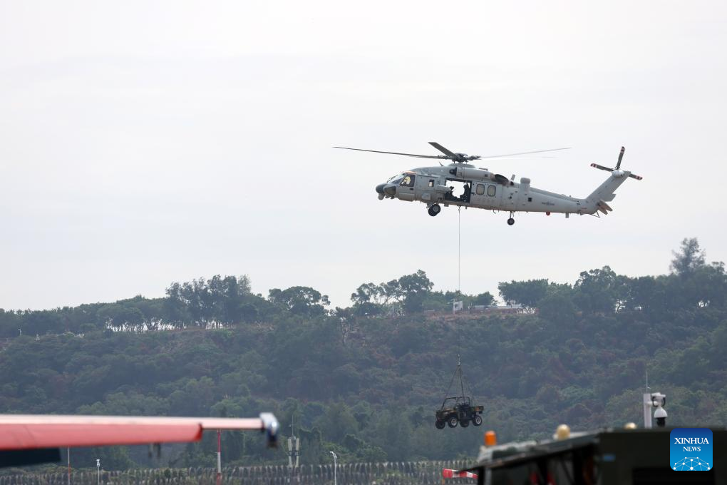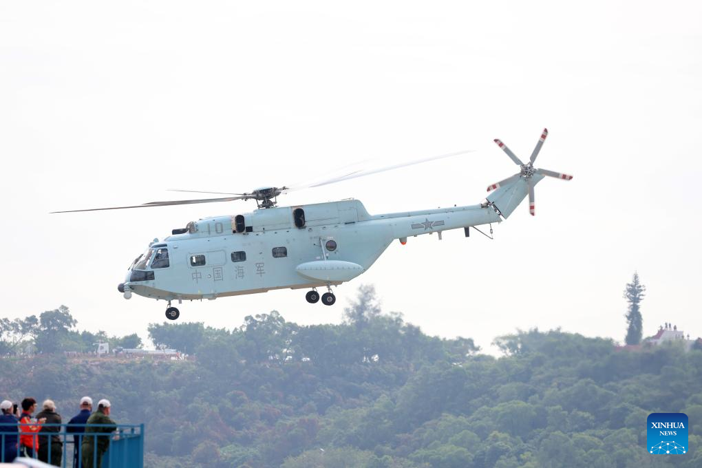 A Z-20J shipborne helicopter conducts adaptive training for the upcoming 15th Airshow China in Zhuhai, south China's Guangdong Province, Nov. 9, 2024. The 15th China International Aviation and Aerospace Exhibition, also known as Airshow China, will be held in Zhuhai from Nov. 12 to 17. (Photo by Ma Ruizhao/Xinhua)
