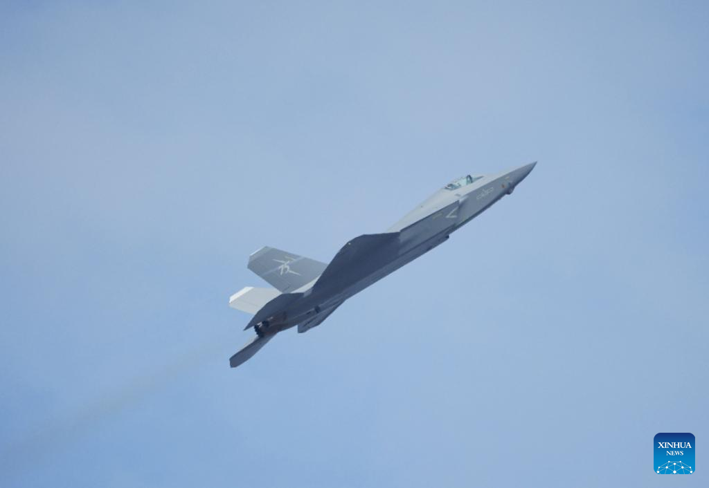 A J-35A fighter jet conducts adaptive training for the upcoming 15th Airshow China in Zhuhai, south China's Guangdong Province, Nov. 9, 2024. The 15th China International Aviation and Aerospace Exhibition, also known as Airshow China, will be held in Zhuhai from Nov. 12 to 17. (Photo by Tan Sicheng/Xinhua)