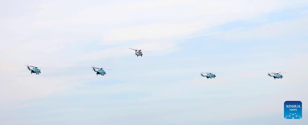 Helicopters conduct adaptive training for the upcoming 15th Airshow China in Zhuhai, south China's Guangdong Province, Nov. 9, 2024. The 15th China International Aviation and Aerospace Exhibition, also known as Airshow China, will be held in Zhuhai from Nov. 12 to 17. (Photo by Ma Ruizhao/Xinhua)