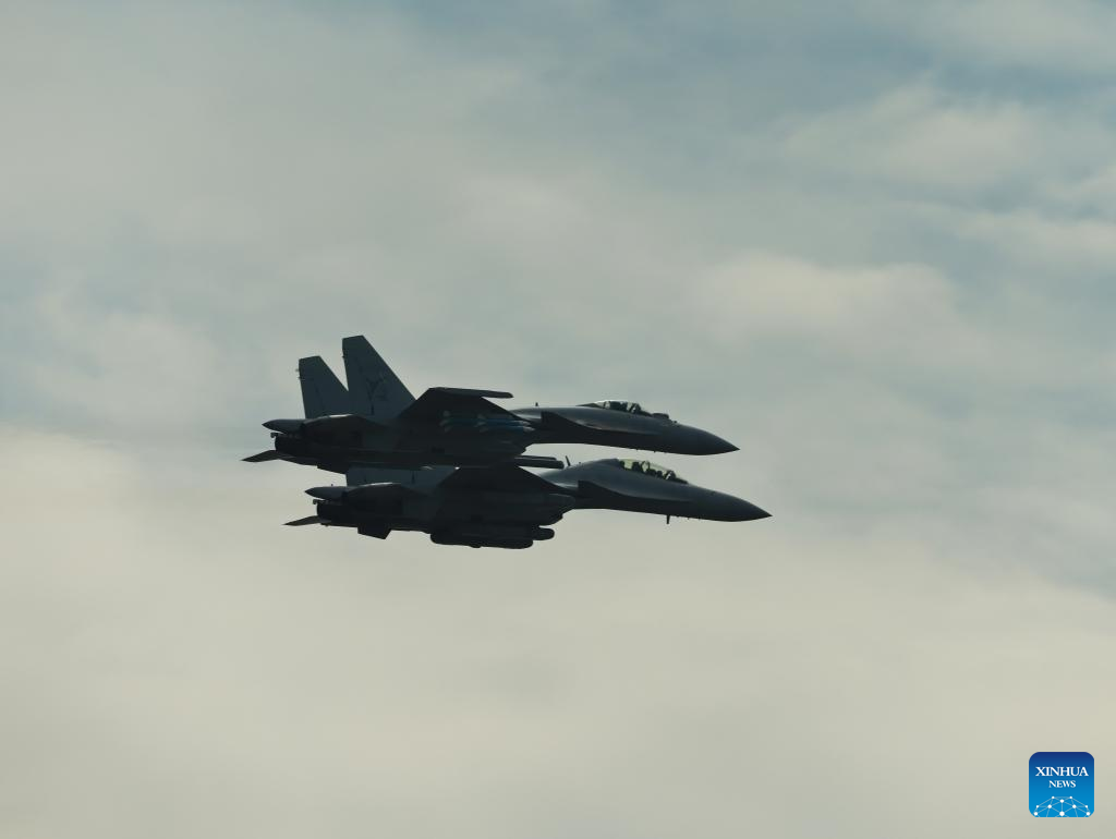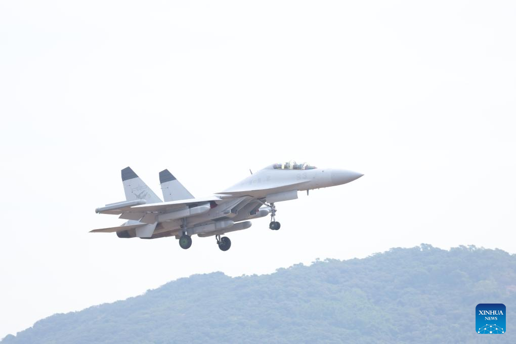 J-15 fighter jets conduct adaptive training for the upcoming 15th Airshow China in Zhuhai, south China's Guangdong Province, Nov. 9, 2024. The 15th China International Aviation and Aerospace Exhibition, also known as Airshow China, will be held in Zhuhai from Nov. 12 to 17. (Photo by Lyu Zhihao/Xinhua)