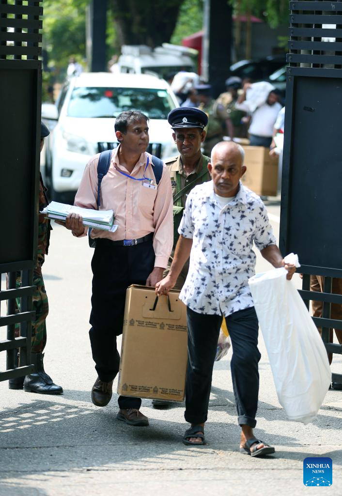 Electoral officials carry ballot boxes and other polling materials in Colombo, Sri Lanka on Nov. 13, 2024. Sri Lanka is set to hold its parliamentary election on Nov. 14, with all necessary preparations in place to ensure a fair and transparent process, Election Commission Chairman R.M.A.L. Ratnayake announced on Tuesday. (Photo by Gayan Sameera/Xinhua)