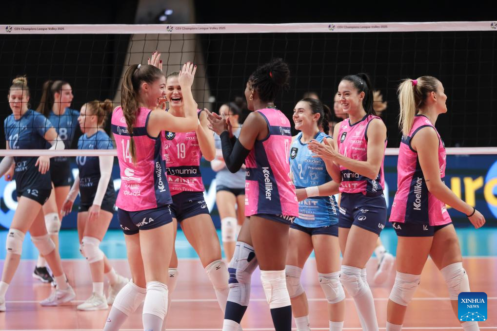 Players of Numia Vero Volley Milano celebrate scoring during the Women's CEV Champions League Volley 2025 between Calcit Kamnik and Numia Vero Volley Milano in Ljubljana, Slovenia, Nov. 12, 2024. (Photo by Zeljko Stevanic/Xinhua)