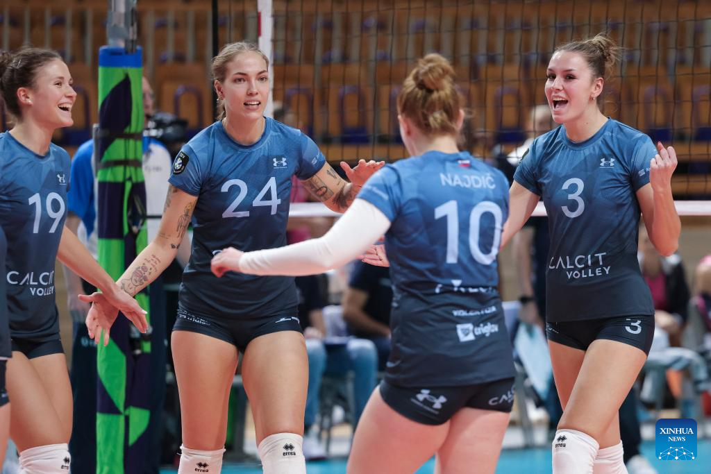 Players of Calcit Kamnik celebrate scoring during the Women's CEV Champions League Volley 2025 between Calcit Kamnik and Numia Vero Volley Milano in Ljubljana, Slovenia, Nov. 12, 2024. (Photo by Zeljko Stevanic/Xinhua)