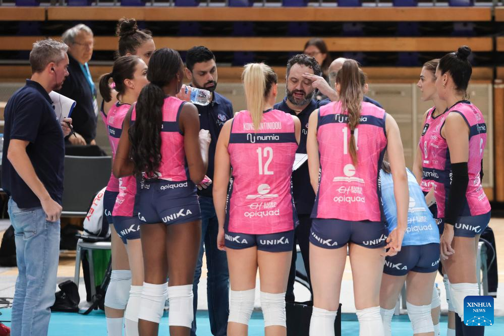 Numia Vero Volley Milano's head coach Stefano Lavarini (C) gives instructions to players during the Women's CEV Champions League Volley 2025 between Calcit Kamnik and Numia Vero Volley Milano in Ljubljana, Slovenia, Nov. 12, 2024. (Photo by Zeljko Stevanic/Xinhua)